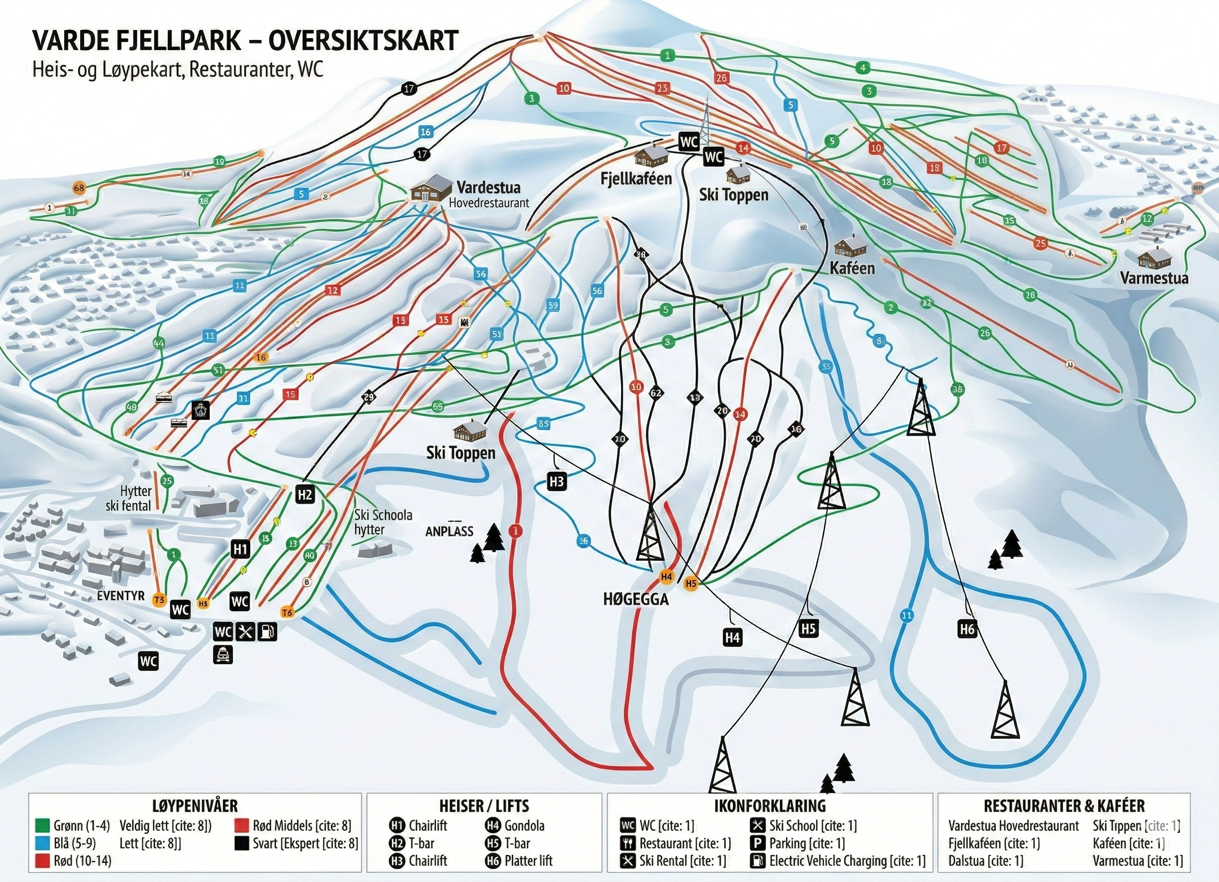 Varde Fjellpark tilbyr en unik bredde i terreng og vanskelighetsgrad, med alt fra skjermede barneområder til teknisk krevende nedfarter. Med våre 6 moderne heiser og 17 preparerte løyper, ligger alt til rette for magiske øyeblikk på toppen av hverdagen. Enten du foretrekker rolige svinger i puddersnø eller adrenalinfylte utfordringer, finner du din favoritt hos oss.